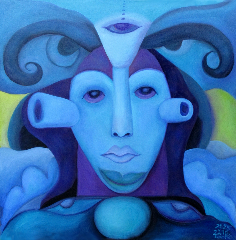 Alles geht langsamer, wird dunkler. Nie weiß man, was draus wird, aus Allem, den Gedanken, die sich ansammeln zu einem dicken Knoten, der unauflöslich erscheint. Manchmal kommt dann wieder ein Licht. Diese Mal war es blau. Ein blaues Wesen schaut mich an und wird für kurze Zeit zu einem Freund. Dann muss es für eine Weile aus meiner Nähe, weil alles erdrückt. Die unheimlich Weite ist noch nicht offen. Ölgemälde “ Blauer Freund“ 50 x 50 cm (27.Oktober 2025)