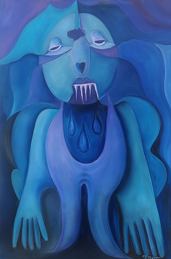 Blaublau ist seltsam, aber Realität. Blau kann schön und erfrischend sein. Jetzt fehlt aber das richtige gute, beruhigende, offene, nasse Blau. Im Moment ist es traurig, kraftlos und versperrt gegen alles, was da noch kommen könnte. Die Angst vor Blauschwarz kommt von oben, oder von überall, bedrückend und schwer. Ölgemälde “ Blaublau“ 70 x 100 cm (18. November 2025)