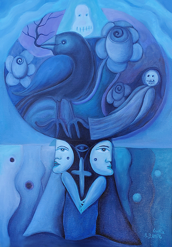 Der Baum ist voller Rosenträume in Blau. Das Paar im Baumstamm kalt und distanziert. Mit offenen Augen im Tod verbunden, weil es ja keine Zeit gibt, im Inneren der Träume. Die Planeten der Heilung sind im Wasser versunken. Nur der dunkle Vogel kennt den Ausgang in die Freiheit. Er ist das Zeichen, dass das Unmögliche wahr werden kann.