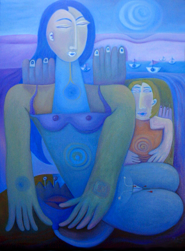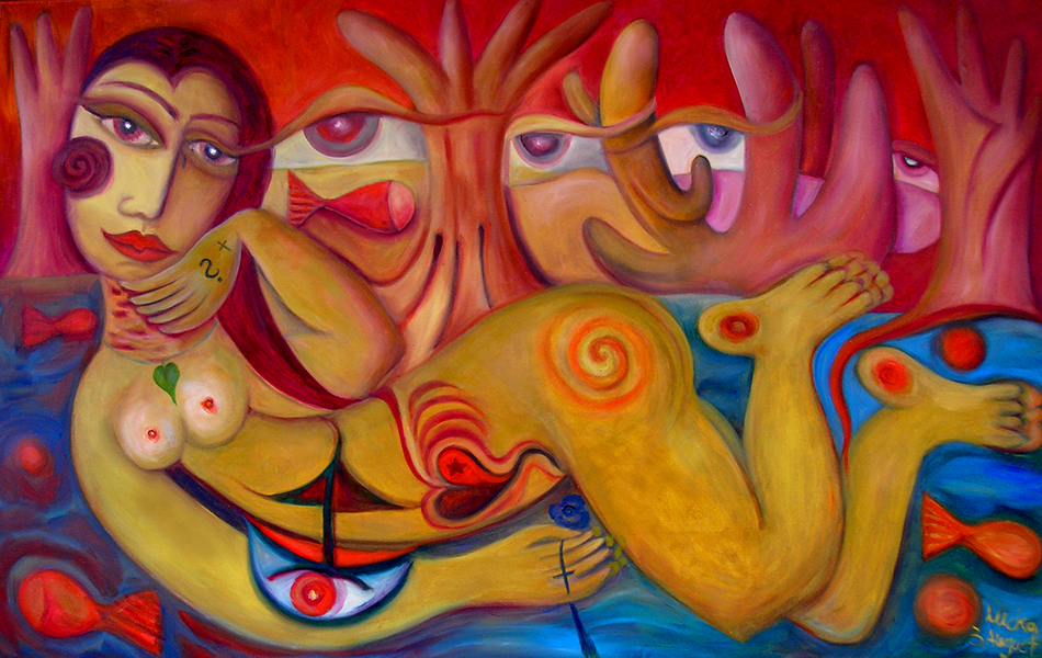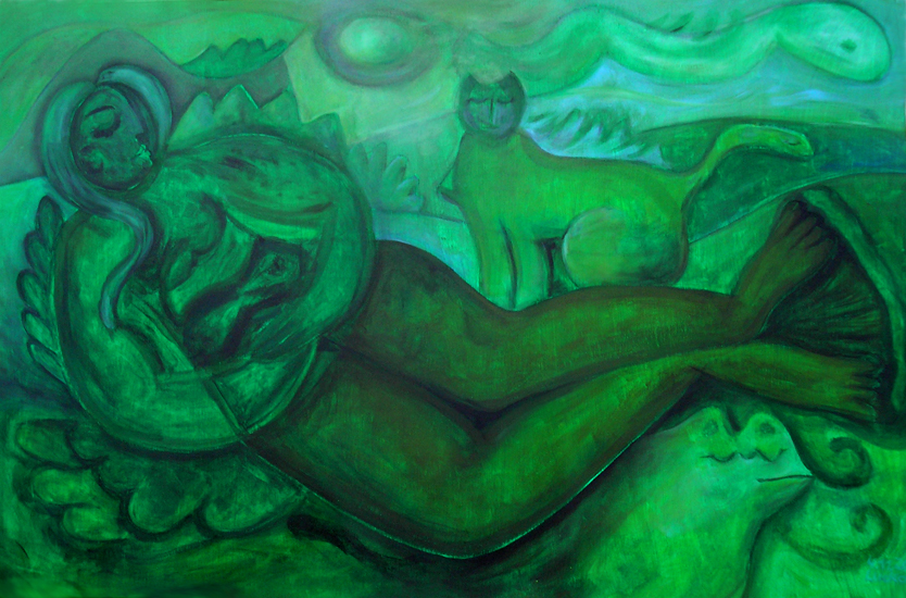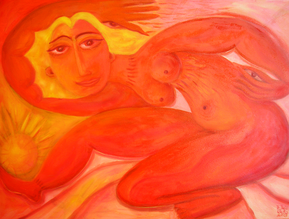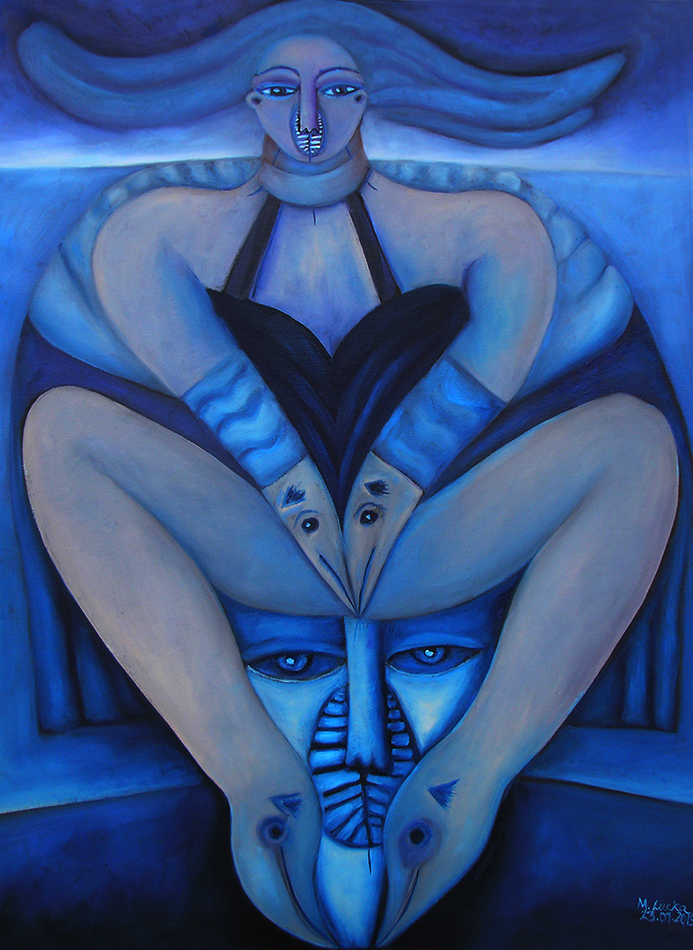 Meine „Aktbilder“ entstehen ebenfalls ohne Skizzen oder Modell aus einer Stimmung heraus und ohne große Überlegung. Ich weiß lediglich, dass ich eine Frau in einer Landschaft, verbunden mit der Landschaft oder der Natur darstellen möchte. Warum zb. häufig Bluttropfen zu sehen sind oder Körper Verletzungen aufweisen kann ich bewußt nicht erklären. Es ist einfach so. Alles ensteht automatisch. 1980 enstand so mein erster Akt in dem eine fragend schauende Frau mit großen Augen neugierig aus einer grünlichen, frischen Landschaft in die Welt schaut. Alles scheint neu zu sein, scheint sie zu verwundern. Dabei ist sie aber neugierig, was da noch kommen könnte. Ich war damals 17 Jahre alt und dieses Gefühl der Verunsicherung wollte wohl so aus mir heraus. Bei der „Frau in Blau“(2005) vermischt sich weibliches Rot mit kaltem Blau…diese Frau war in ihrem Lebem schon machem seelischen, wohl auch körperlichen Schmerzen ausgesetzt, was sich sicherlich in keinem Frauenleben vermeiden läßt.