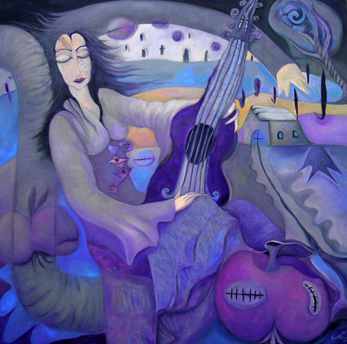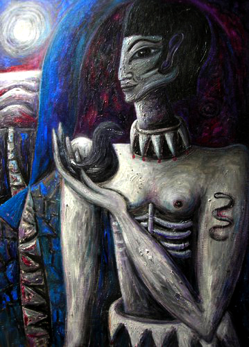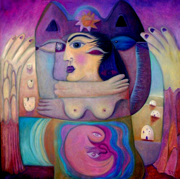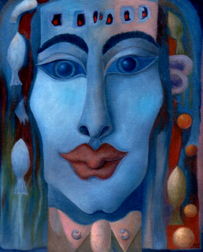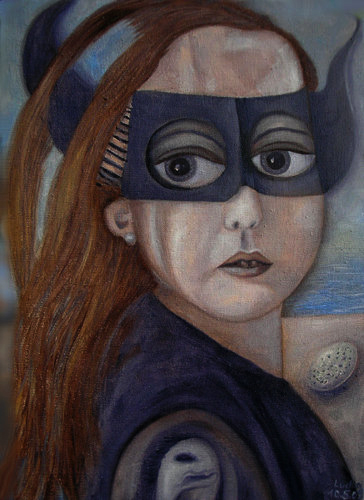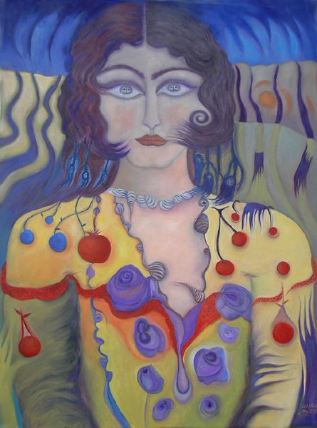 Irgendwann wurde ich gefragt, warum ich keine Männer male? Mir war das bis zu dem Zeitpunkt gar nicht bewusst. Wahrscheinlich habe ich schon mal versucht einen Mann auf die Leinwand zu bannen – zumindest ansatzweise. Aber es wurden immer wieder weiblich aussehende Wesen, die aber durchaus auch männliche Züge haben können. Oder es sind Mischwesen? Aber beim Bearbeiten der Seiten habe ich schon drei bis vier männlich anmutende Gestalten gefunden. Es gibt sie also doch die männlich Bilder. Man muss nur lange genug suchen.