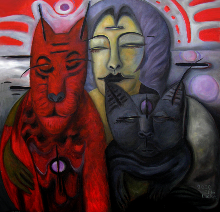 Irgendwann wurde ich gefragt, warum ich keine Männer male? Mir war das bis zu dem Zeitpunkt gar nicht bewusst. Wahrscheinlich habe ich schon mal versucht einen Mann auf die Leinwand zu bannen – zumindest ansatzweise. Aber es wurden immer wieder weiblich aussehende Wesen, die aber durchaus auch männliche Züge haben können. Oder es sind Mischwesen? Aber beim Bearbeiten der Seiten habe ich schon drei bis vier männlich anmutende Gestalten gefunden. Es gibt sie also doch die männlich Bilder. Man muss nur lange genug suchen.