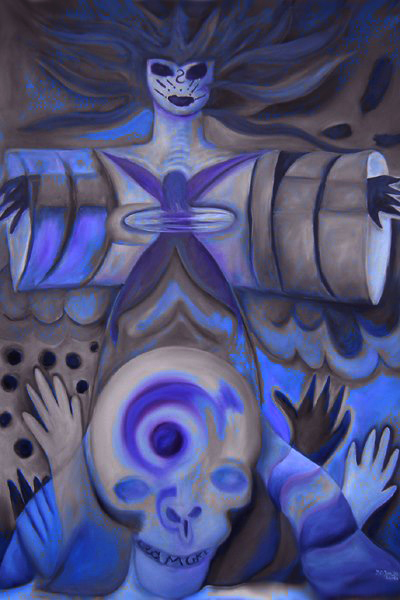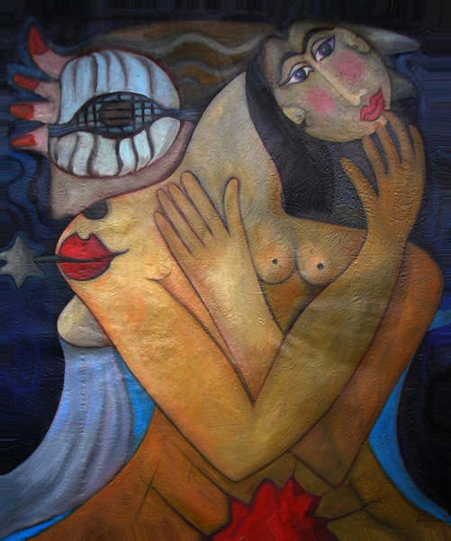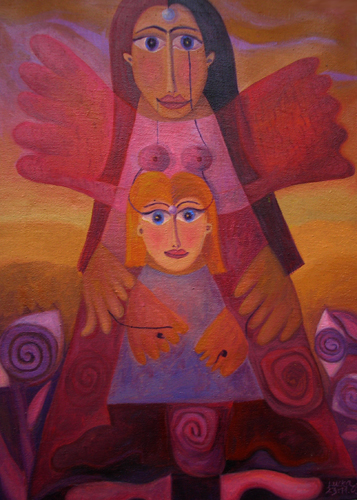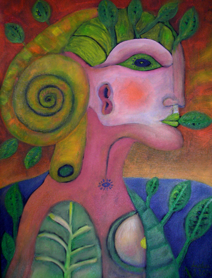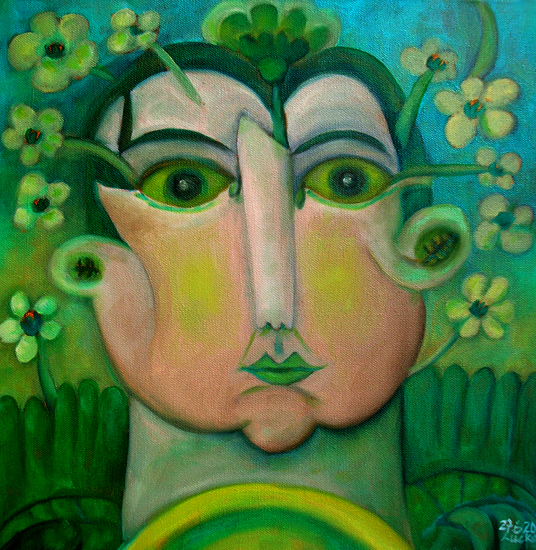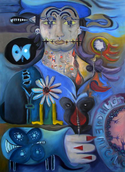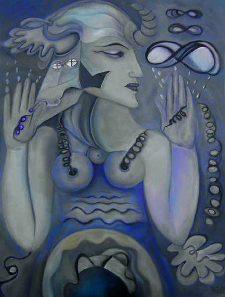 Irgendwann wurde ich gefragt, warum ich keine Männer male? Mir war das bis zu dem Zeitpunkt gar nicht bewusst. Wahrscheinlich habe ich schon mal versucht einen Mann auf die Leinwand zu bannen – zumindest ansatzweise. Aber es wurden immer wieder weiblich aussehende Wesen, die aber durchaus auch männliche Züge haben können. Oder es sind Mischwesen? Aber beim Bearbeiten der Seiten habe ich schon drei bis vier männlich anmutende Gestalten gefunden. Es gibt sie also doch die männlich Bilder. Man muss nur lange genug suchen.