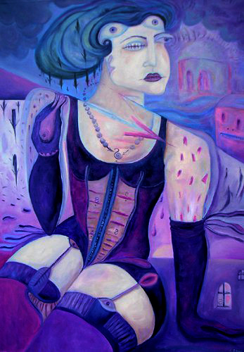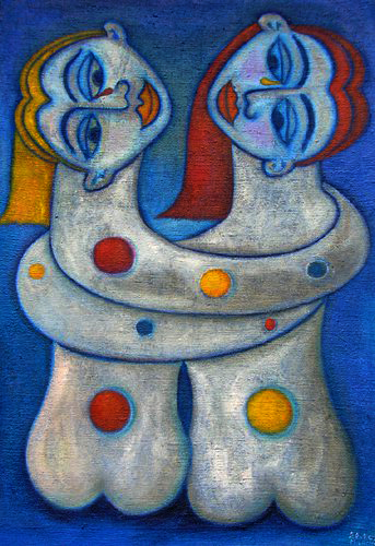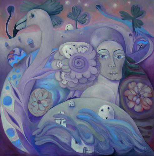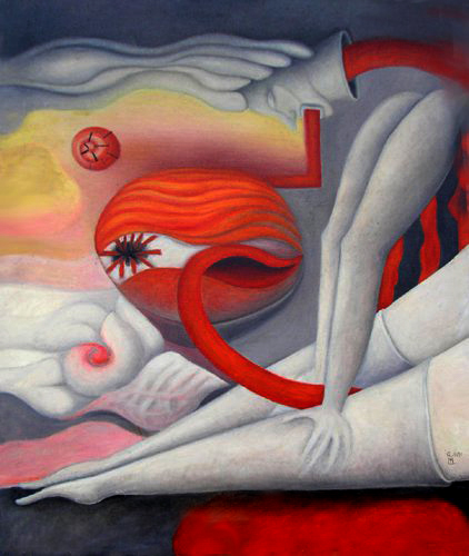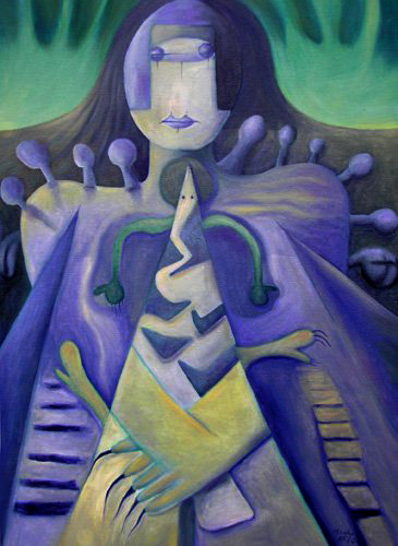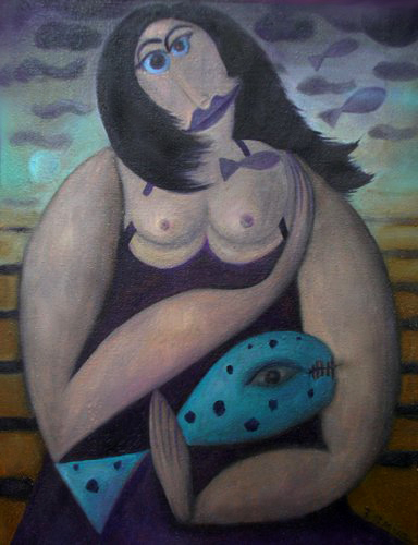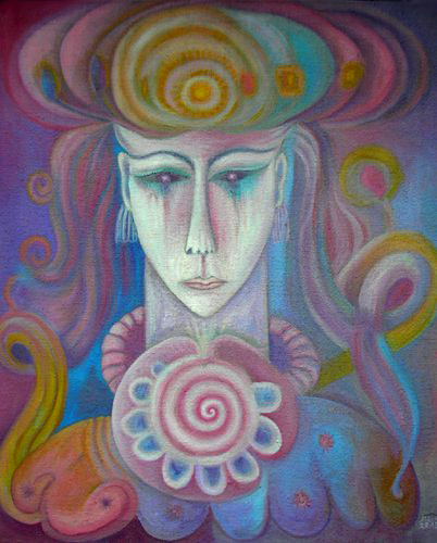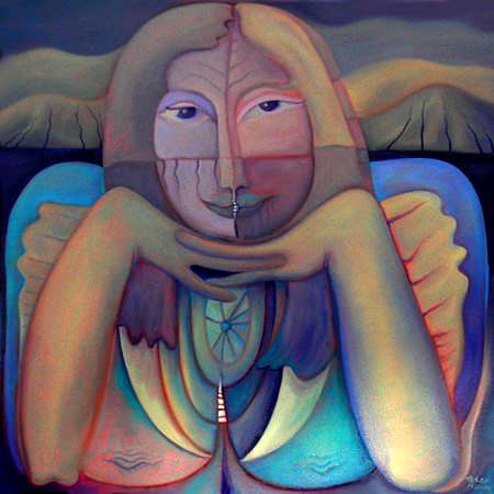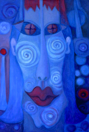 Irgendwann wurde ich gefragt, warum ich keine Männer male? Mir war das bis zu dem Zeitpunkt gar nicht bewusst. Wahrscheinlich habe ich schon mal versucht einen Mann auf die Leinwand zu bannen – zumindest ansatzweise. Aber es wurden immer wieder weiblich aussehende Wesen, die aber durchaus auch männliche Züge haben können. Oder es sind Mischwesen? Aber beim Bearbeiten der Seiten habe ich schon drei bis vier männlich anmutende Gestalten gefunden. Es gibt sie also doch die männlich Bilder. Man muss nur lange genug suchen.